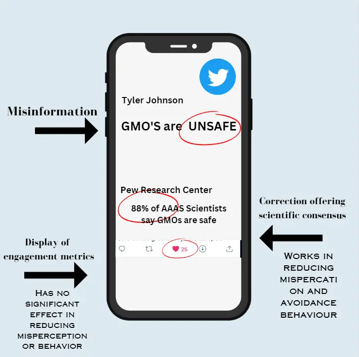 Current research suggests that expert organizations can be effective in reducing misperceptions when they respond to health and scientific misinformation on social media. We examine this through the case for safety of genetically modified food. We focus on whether, as claimed by the Gateway Belief Model, communicating that experts have a consensus works as a way to reduce misperceptions and whether displaying social media engagement metrics– “likes” on twitter– can amplify this effect. To test this, respondents randomly saw one of six simulated twitter feeds– misinformations feeds claimed the GMOs are unsafe and had no responses, in correction feeds PEW Research Center says that 88% of the scientific community claims otherwise but has no likes and in the other condition this response has 35 “likes” .