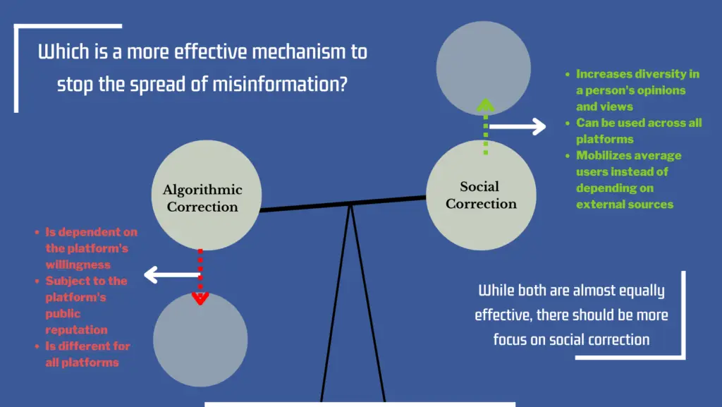 While the difference is marginal, we suggest that the focus should be more on social correction at least for emerging health issues, because algorithmic correction is based on the company’s willingness to reduce the spread of misinformation and differs from platform to platform- for instance, twitter and reddit do not have a ‘related stories’ feature. Moreover, trust in algorithms is tied to trust in the company- one piece of bad news can negatively affect algorithmic correction efforts. Moreover, using social correction makes it possible for social media users to engage with opinions and ideas beyond what they believe in- making them more informed.